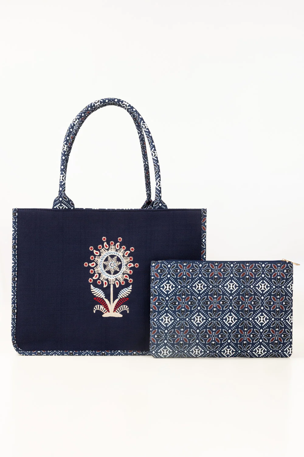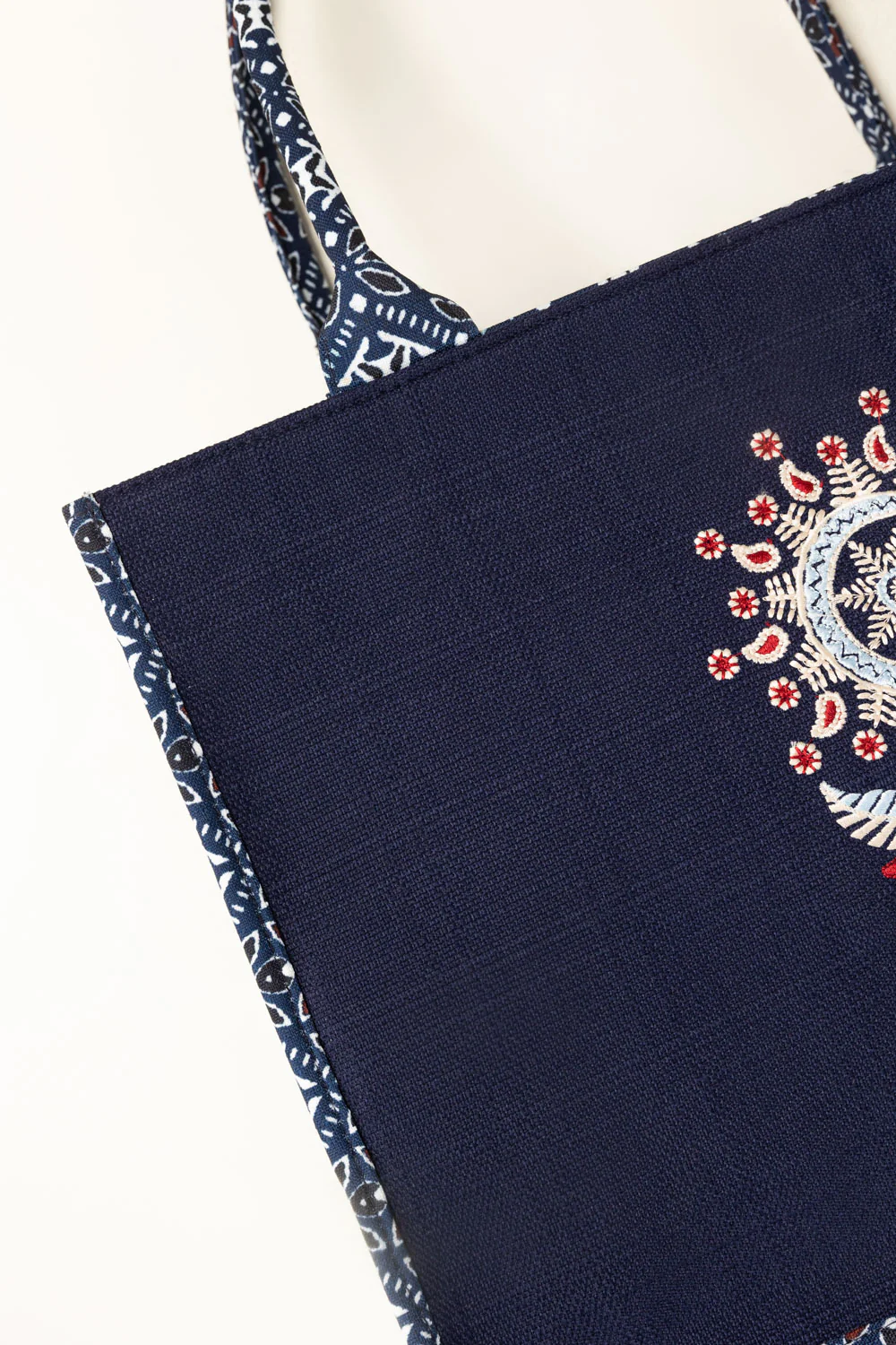 This canvas tote features flower embroidery with matching cultural printed handles for a coordinated look. Lightweight yet spacious, it comfortably carries daily essentials and includes a matching zip pouch for easy organization.